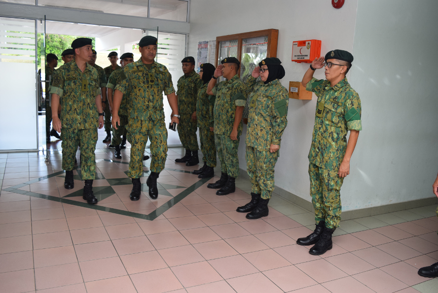 The visit commenced in the morning at Sp Bn RBLF Headquarters. Upon arrival, the delegation was welcomed by Lieutenant Colonel Rudie Asmawi bin Haji Abidin, Commanding Officer of Sp Bn RBLF. The delegation was invited for a group photo followed by the signing of parchment by the Commander of RBLF. The Commander of RBLF was then briefed by Major Masmun bin Haji Kassim, Second in Command (2IC) of Sp Bn RBLF on the inspection findings for Sp Bn RBLF. The visit proceeded to the former RBAirF Squadron 33 building and concluded with lunch at Penanjong Garrison Officer's mess.