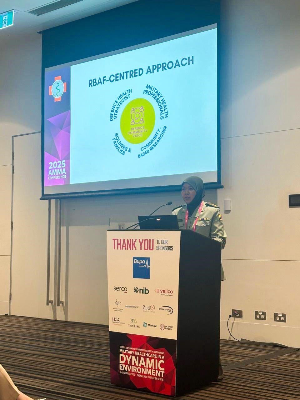 Lieutenant Colonel (Dr.) Ummi Suzeyanna was accompanied by Lieutenant (Dr.) Wan Nurul Naszeerah binti Mohammed Zainal Abidin Ariff, Research Officer for Medical Services, RBLF, who presented her work titled “Listening to the Force: A Social Listening Framework for Defence Health Research and Innovation". Her presentation shared key findings from her doctoral research on vaccine confidence and infodemics within Malay-speaking communities in Southeast Asia and its relevance to enhancing force health protection in Brunei Darussalam. The AMMA Conference serves as a vital platform to advance military medical research, showcase innovations and support the development of future military healthcare leaders.