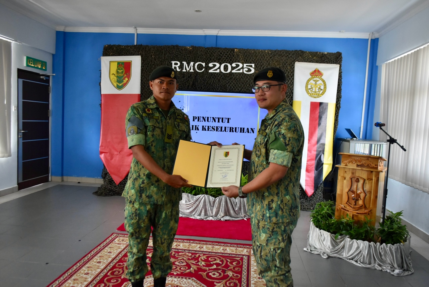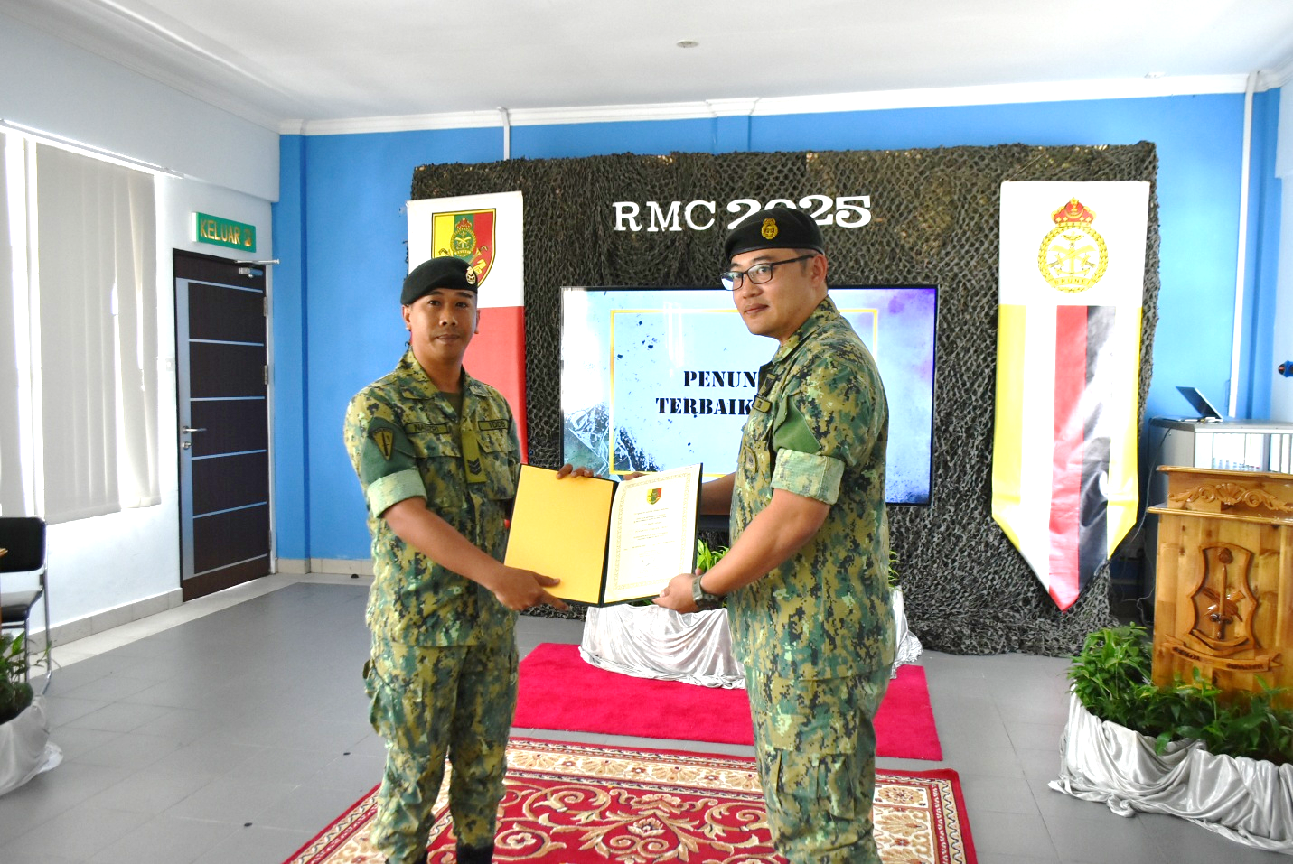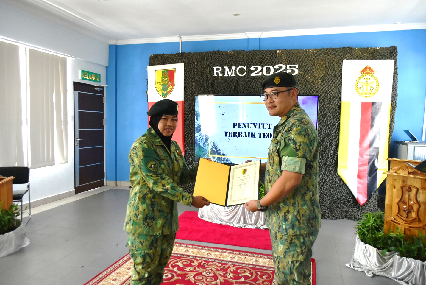 PENANJONG GARRISON, Thursday, 23rd October 2025 – The closing ceremony for the Range Management Course (RMC) took place at the Theatre Room, School of Infantry, Royal Brunei Land Forces (SOI RBLF), Penanjong Garrison. The course was held from 28th August to 22nd October 2025, with a total of 45 course participants consisting of 28 from the RBLF, 2 from the Royal Brunei Navy, 3 from the Royal Brunei Air Force, 4 from the Ministry of Defence, one from the Special Forces Regiment Royal Brunei Armed Forces, and one from the Royal Brunei Police Force (RBPF).