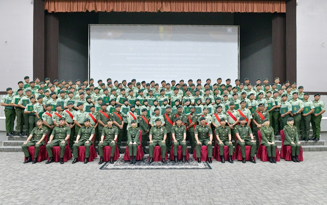 BERAKAS GARISON, Jumaat, 28 November 2025 – Kursus Kepimpinan Pegawai Tidak Bertauliah (PTB) Rendah Tentera Darat Diraja Brunei (TDDB) Siri 3/2025 telah menutup tirainya dengan acara penutup yang berlangsung di Dewan Pahlawan, Berakas Garison. Kursus tersebut telah dijalankan bermula dari 31 Oktober hingga 28 November 2025, melibatkan penyertaan seramai 120 anggota daripada pelbagai sub-unit TDDB.