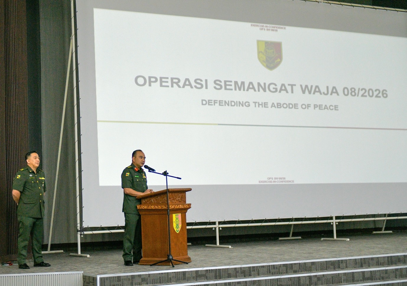 DEWAN PAHLAWAN, Jumaat, 9 Januari 2026 – Markas Tentera Darat Diraja Brunei (TDDB) telah melaksanakan Taklimat Eksesais bagi Field Training Exercise (FTX) Eksesais SEMANGAT WAJA (SW) 08/2026 bertempat di Dewan Pahlawan, Berakas Garison. Taklimat tersebut telah dihadiri oleh Kolonel Mohammad Fakaruddin Zuraidie bin Haji Ramli, Pemerintah Medan TDDB dan Kolonel Erwan bin Haji Ibrahim, Ketua Staf TDDB yang juga selaku Pengarah Eksesais SW 08/2026, bersama Pegawai-pegawai Kanan dan Pegawai-pegawai daripada semua sub-sub unit TDDB.