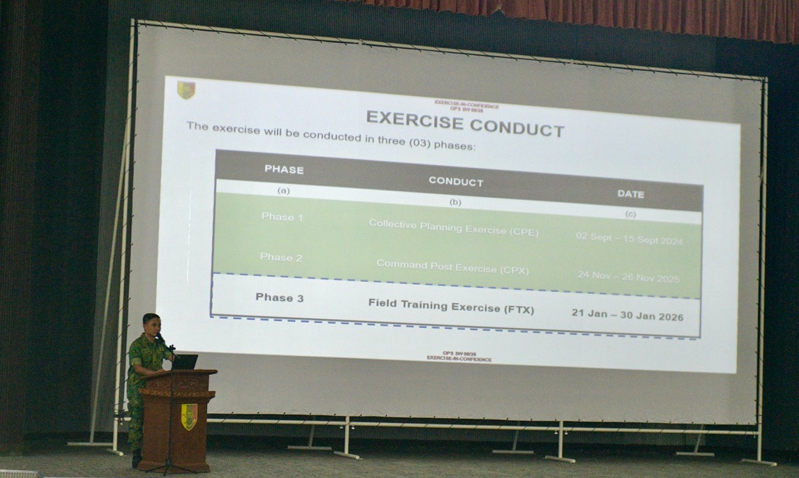 The briefing commenced with the recitation of Surah Al-Fatihah, followed by a presentation on the situation review derived from the Command Post Exercise (CPX) SW 08/2026 conducted in November 2025. The objective of the briefing is to ensure unity of effort by providing every participant with a clear understanding of the mission and plan towards achieving Mission Ready Land Forces, while ensuring compliance with the safety and security protocols throughout the exercise. The FTX is scheduled to take place from 21th January 2026 until 30th January 2026.