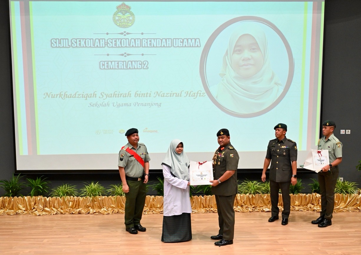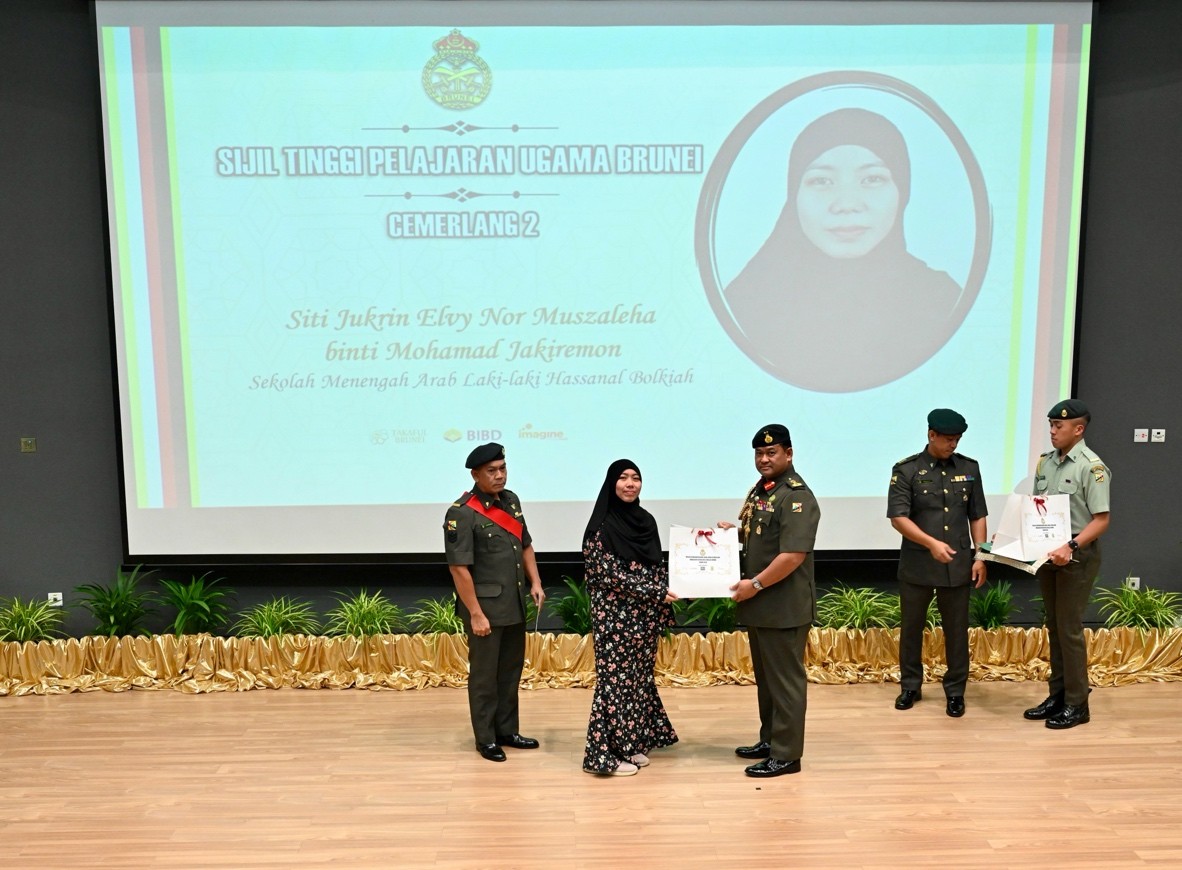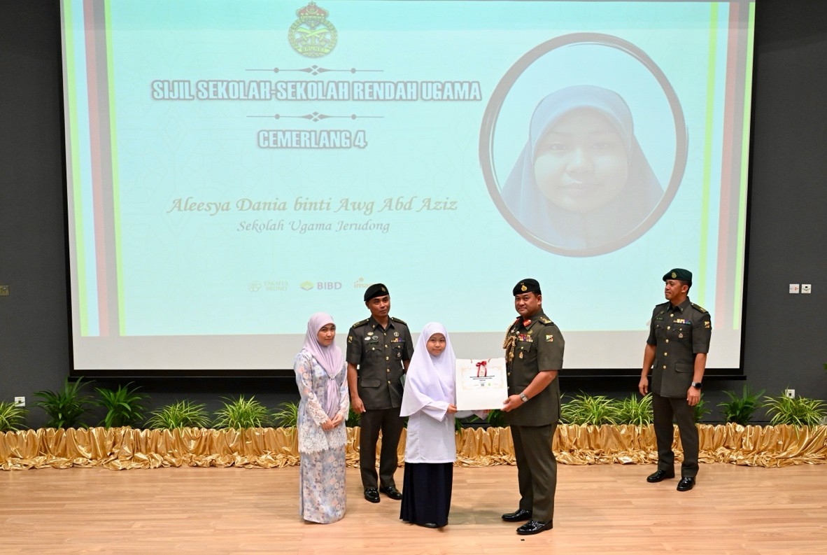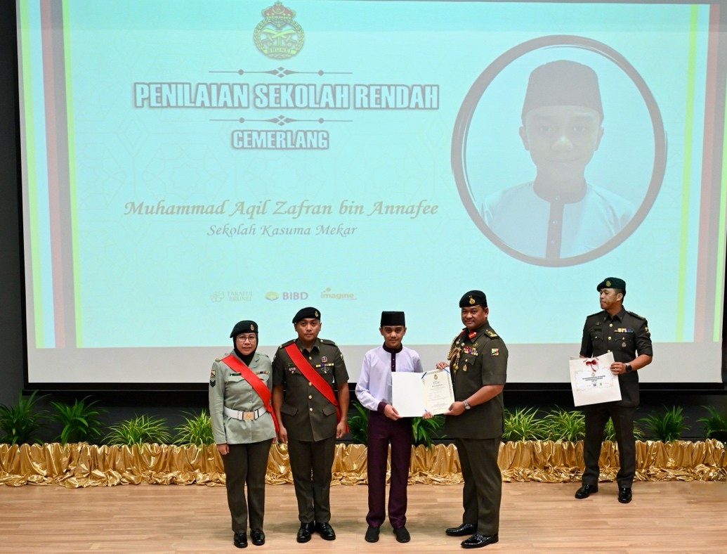 TANAH JAMBU, Friday, 09 January 2026 – The Royal Brunei Armed Forces (RBAF) held an Outstanding Awards Ceremony today at the Defence Academy Auditorium, Tanah Jambu, to honour the academic achievements of the children of its personnel for the year 2025. A total of 146 recipients, including 53 children from the Royal Brunei Land Forces (RBLF), received excellence and appreciation awards in the form of certificates and gifts for their outstanding results in the International Baccalaureate (IB), General Certificate of Education (GCE) 'A' Level, GCE 'O' Level, Sijil Pelajaran Ugama Brunei (SPUB), Sijil Pelajaran Tinggi Ugama Brunei (SPTUB), Sijil Sekolah-Sekolah Rendah Ugama (SSSRU), and Penilaian Sekolah Rendah (PSR).
