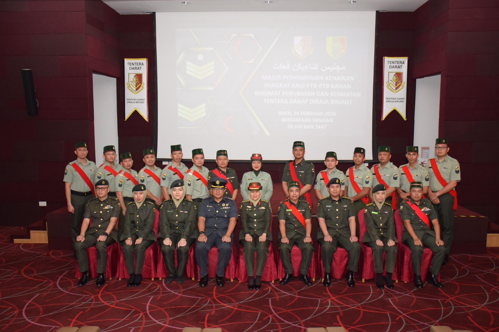 BRUNEI, Isnin 16 Februari 2026 – Acara Kenaikan Pangkat bagi seramai 92 Pegawai-pegawai Tidak Bertauliah (PTB-PTB) Kanan dan PTB-PTB Rendah daripada pelbagai sub-unit Tentera Darat Diraja Brunei (TDDB) telah diadakan sepanjang minggu di unit masing-masing. Anggota yang dinaikkan pangkat terdiri dari Markas TDDB, Kompeni Markas TDDB, Markas Medan, Khidmat Bantuan Kombat, Skuadron Bot Tempur TDDB serta Skuadron Kereta Perisai Peninjau TDDB. Acara tersebut telah dihadiri oleh Pegawai-pegawai Kanan, Pegawai-pegawai dan anggota TDDB di unit masing-masing.