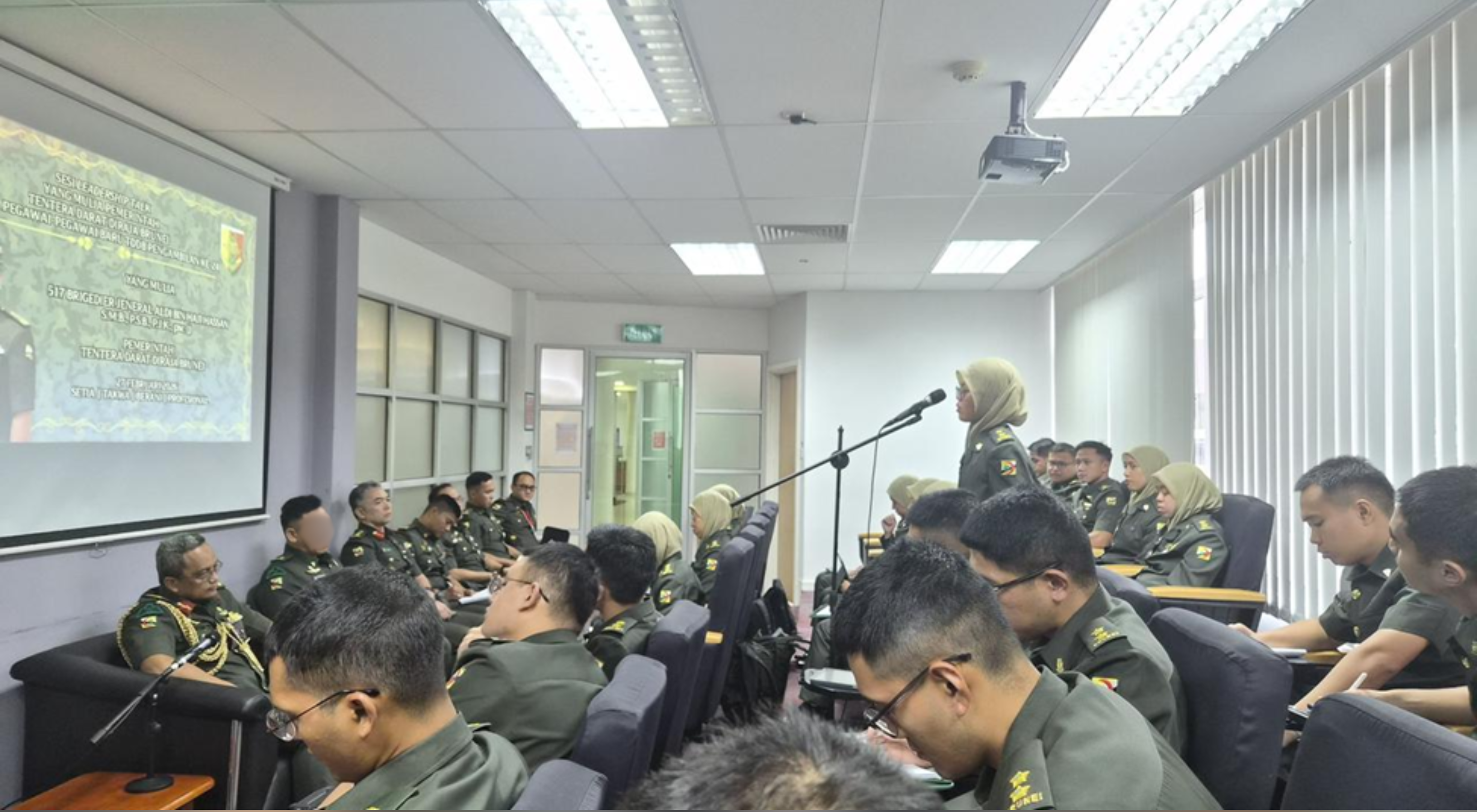 BERAKAS GARISON, Jumaat, 27 Februari 2026 – Seramai 20 Pegawai Tentera Darat yang baru ditauliahkan daripada Sekolah Pegawai Kadet Pengambilan ke-24 telah menghadiri Sesi Kepimpinan bersama Brigedier Jeneral Aldi bin Haji Hassan, Pemerintah Tentera Darat Diraja Brunei (TDDB) bertempat di Markas TDDB, Berakas Garison.