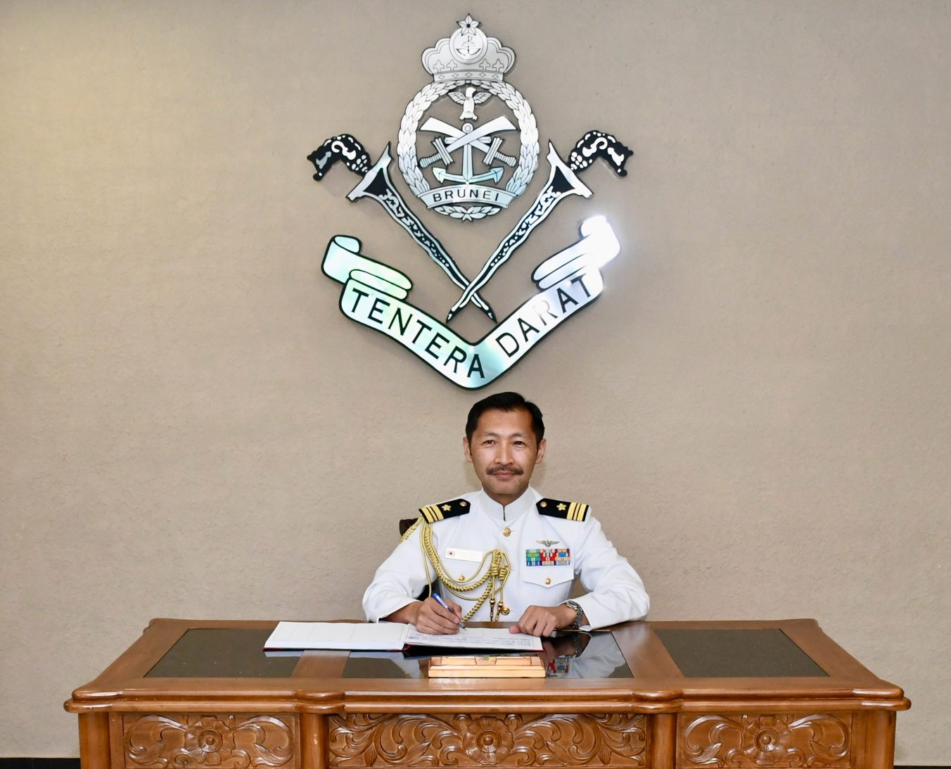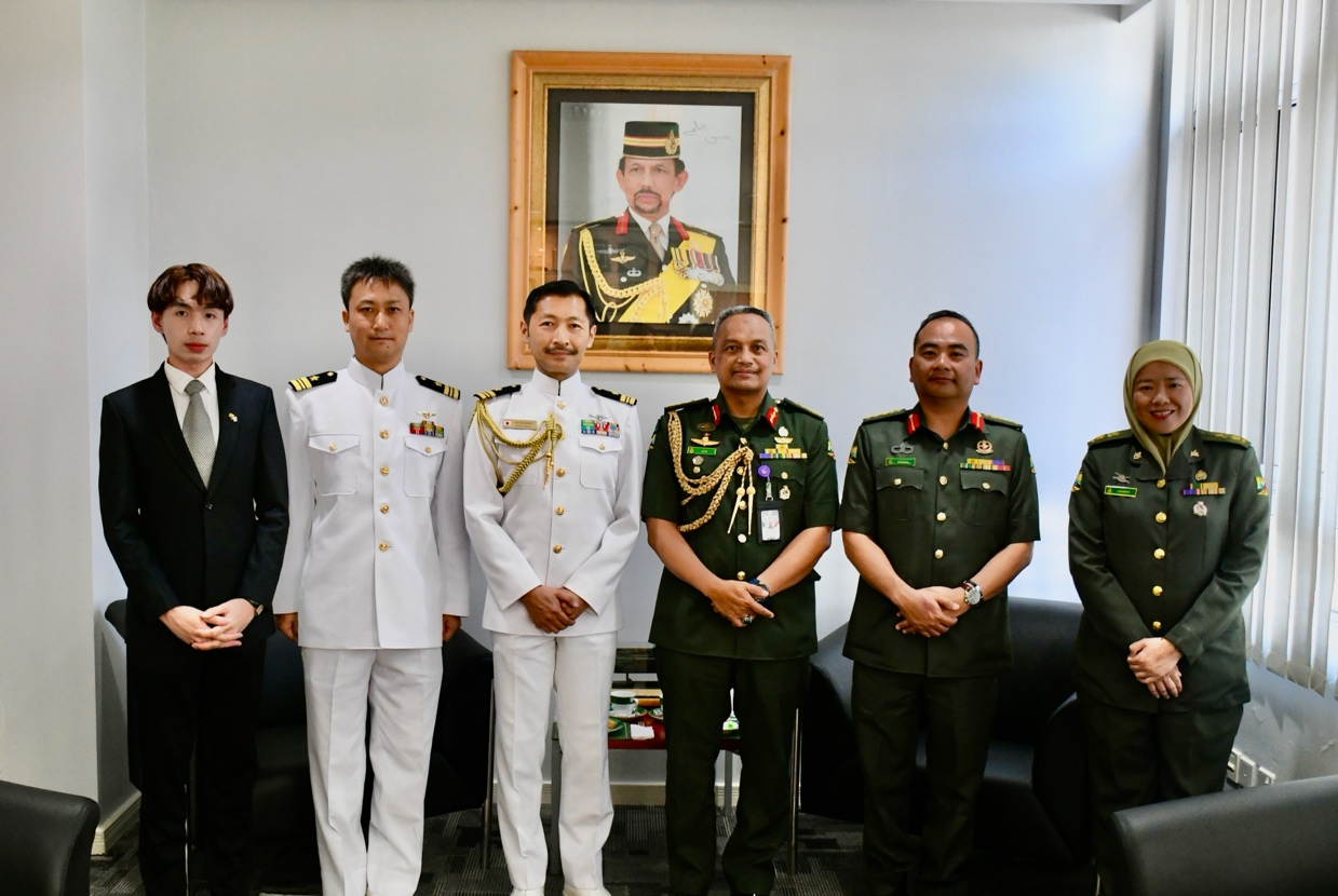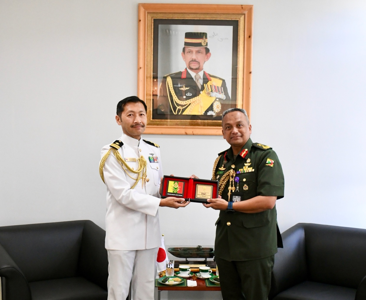 BERAKAS GARISON, Rabu, 15 April 2026 – Brigedier Jeneral Aldi bin Haji Hassan, Pemerintah Tentera Darat Diraja Brunei (TDDB), telah menerima kunjungan pengenalan daripada Leftenan Komander Hasegawa Takeshi, Atase Pertahanan Jepun ke Negara Brunei Darussalam yang baru dilantik, bertempat di Markas TDDB, Berakas Garison. Turut hadir ialah Kolonel Erwan bin Haji Ibrahim, Ketua Staf TDDB, dan dan Leftenan Komander Toshifumi Wada, yang akan menamatkan tempoh perkhidmatan sebagai Pegawai Hal Ehwal Keselamatan dan Pertahanan di Kedutaan Jepun di Negara Brunei Darussalam.