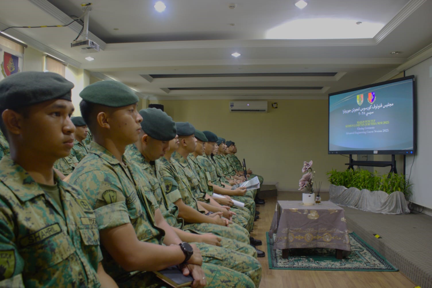 PENANJONG GARISON, Rabu, 15 April 2026 – Majlis penutup bagi Kursus Jurutera Lanjutan telah diadakan di Markas Rejimen Jurutera, Tentera Darat Diraja Brunei (RJ TDDB), Penanjong Garison. Seramai 25 peserta kursus yang terdiri daripada RJ TDDB serta Platun Rintis Serang daripada Batalion Pertama dan Batalion Kedua (1Bn dan 2Bn TDDB) telah menamatkan kursus tersebut selama sembilan minggu, yang dikendalikan oleh Cawangan Jurutera Asas, Sekolah Kejuruteraan, RJ TDDB bermula dari 6 Februari 2026 hingga 15 April 2026. Acara penutup telah disempurnakan oleh Mejar Haji Abdul Rahim bin Haji Adris, Pemangku Pegawai Pemerintah RJ TDDB.